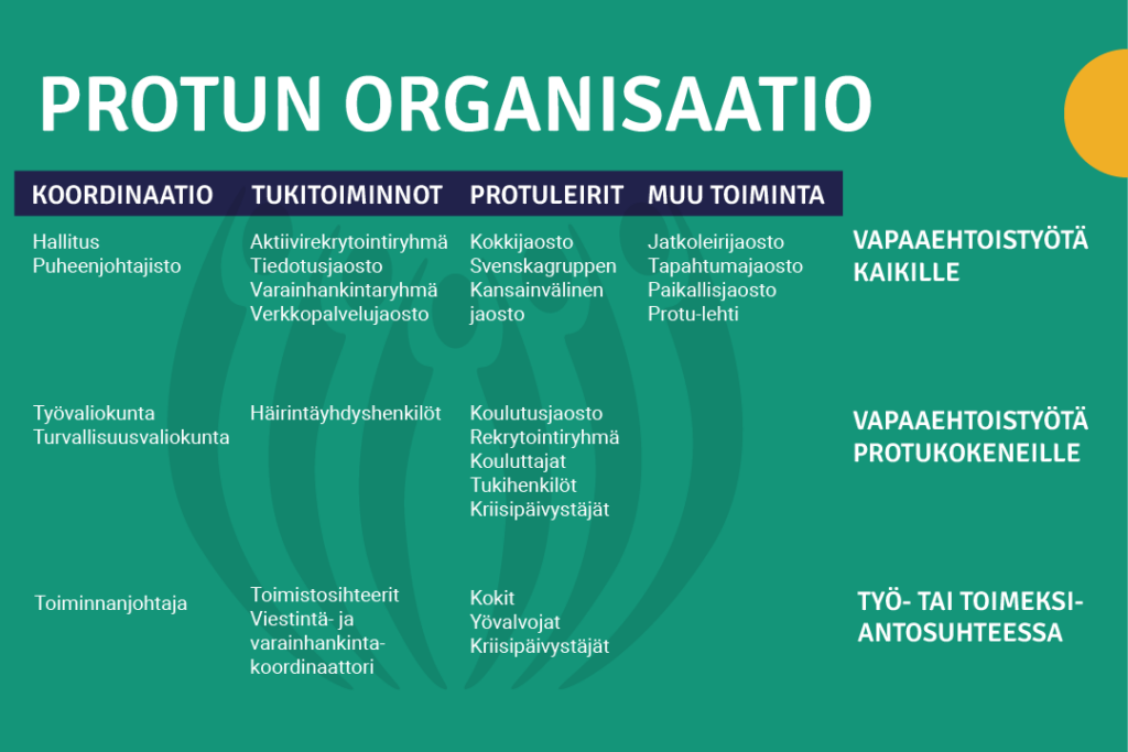 Protu-leirillä on noin 18 leiriläistä, 1-2 kokkia ja 7-8 hengen tiimi. Tiimi yleensä koostuu kahdesta yli 20-vuotiaasta aikuisesta ohjaajasta ja 5-6 apuohjaajasta, ja he ovat vastuussa leirin suunnittelusta ja järjestymisestä. Tiimi toimii nimensä mukaisesti tiiminä eli he muodostavat toimivan kokonaisuuden, jossa heidän vahvuutensa täydentävät toisiaan. Leirin suunnittelussa ja vetämisessä apuohjaajilla ja ohjaajilla on yhdenvertainen asema. Tiimiläisten tulee olla valmiita kompromisseihin yhteisten tavoitteiden edistämiseksi, mutta yksittäisten tiimiläisten tulee myös pystyä työskentelemään yksin. Ei kuitenkaan ole tarkkaa määritelmää hyvästä tiimiläisestä tai siitä, millainen kuuluisi olla, jotta voisi hakea tiimiin. Tärkeää on se, että on motivaatiota sekä aikaa leirin vetämiseen ja erityisesti sen suunnitteluun. On hyvä pitää mielessä, että leirillä oleminen on intensiivistä, ja omaa aikaa siellä saattaa olla vain vähän, mutta leirin vetäminen voi silti olla hyvin palkitsevaa.